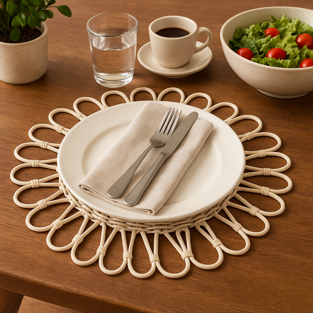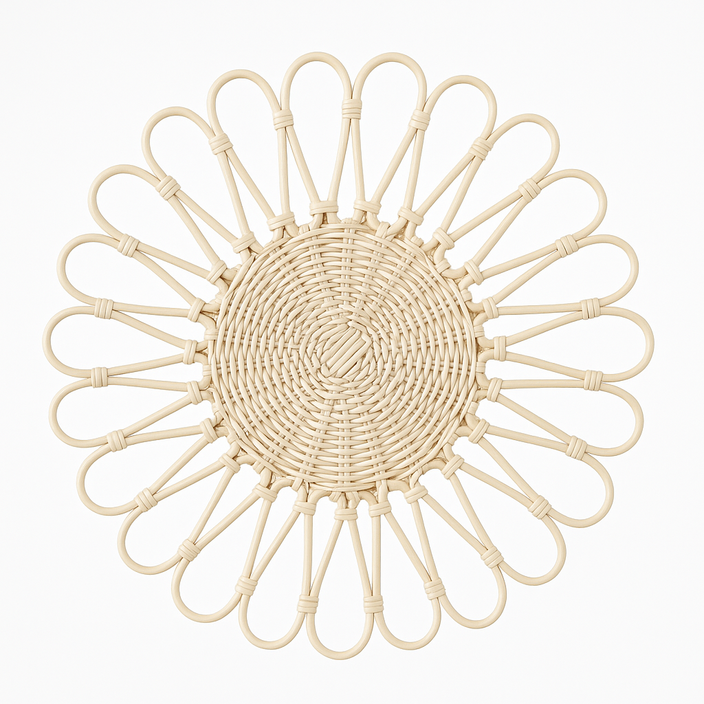 Made from premium natural rattan, this beautifully woven piece blends organic texture with structural elegance. The intricate floral-inspired outer loops and tightly woven center create depth, symmetry, and artisanal charm — making it a must-have for anyone embracing natural dining accessories and earthy interior styling.