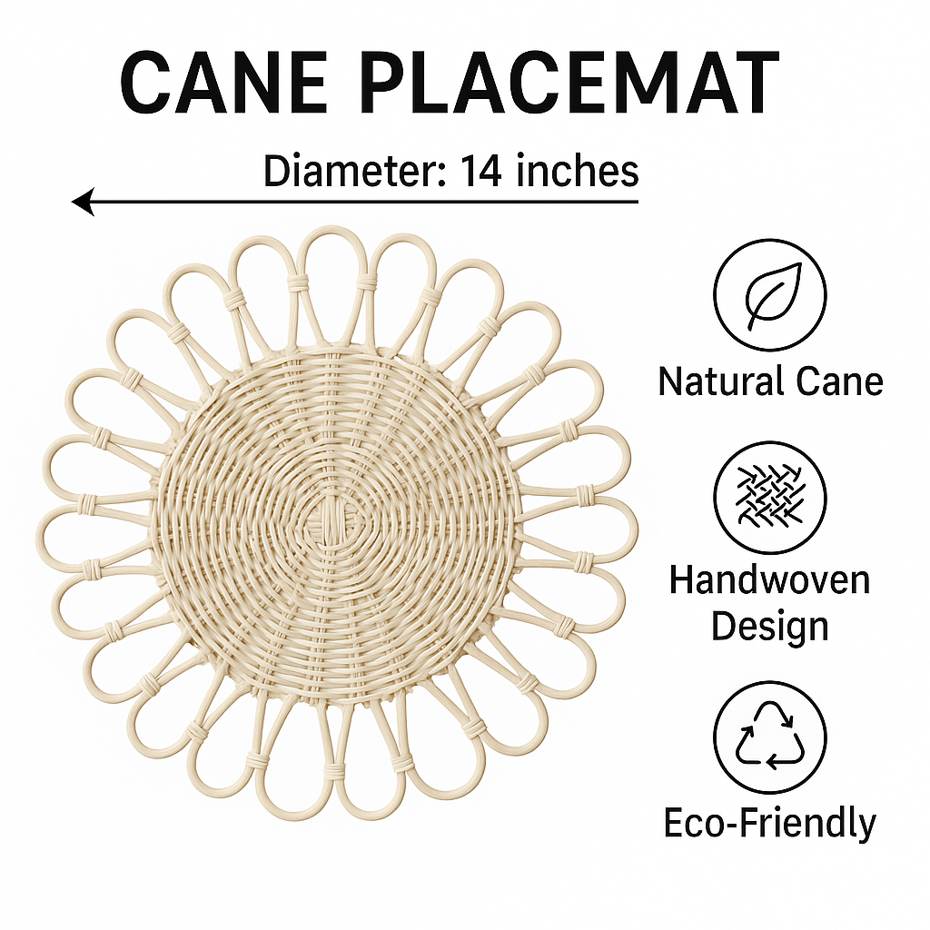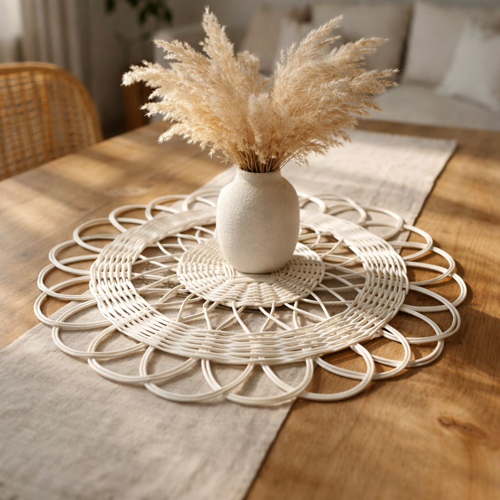 This 35-inch Rattan Placemat is a handcrafted round table mat perfect for boho table decor and eco-friendly table styling. Made from natural rattan, it combines durability, sustainability, and timeless elegance.